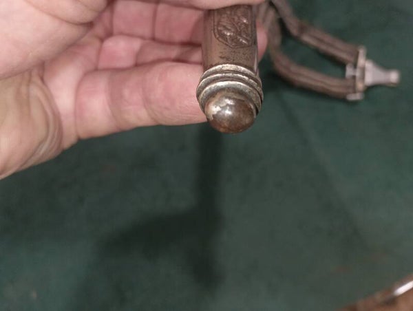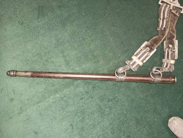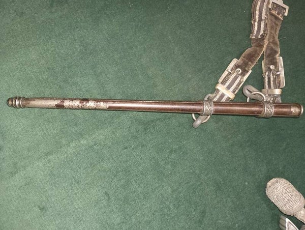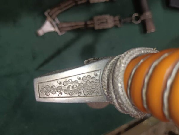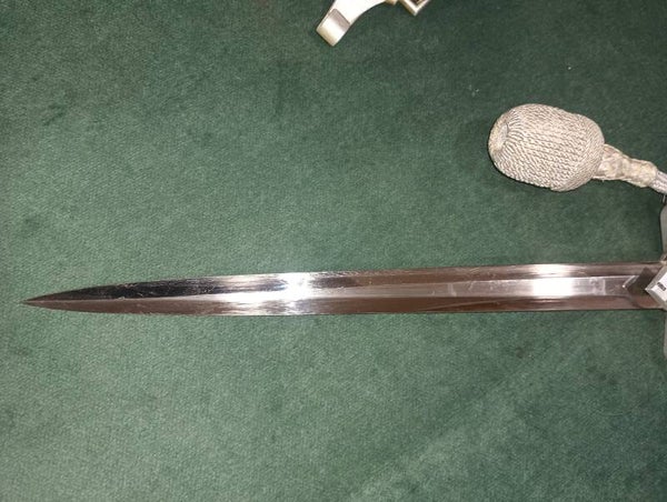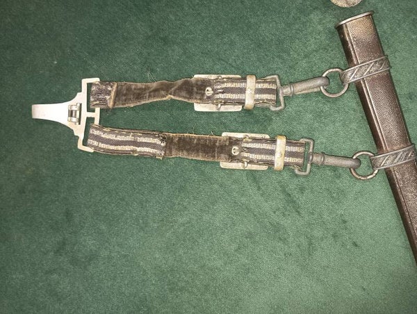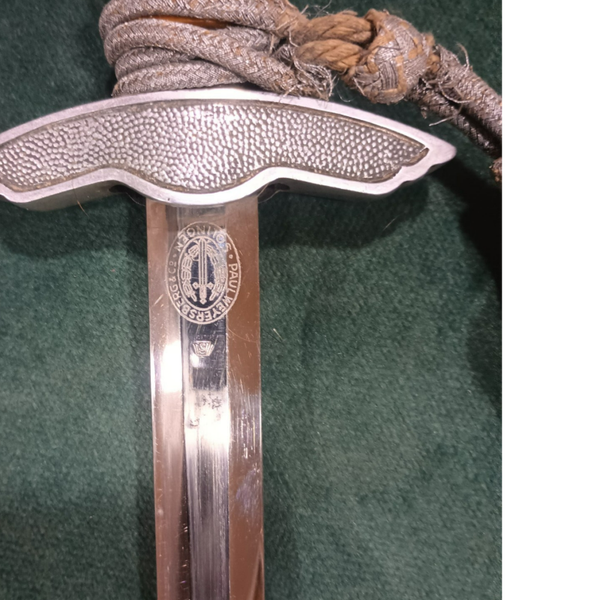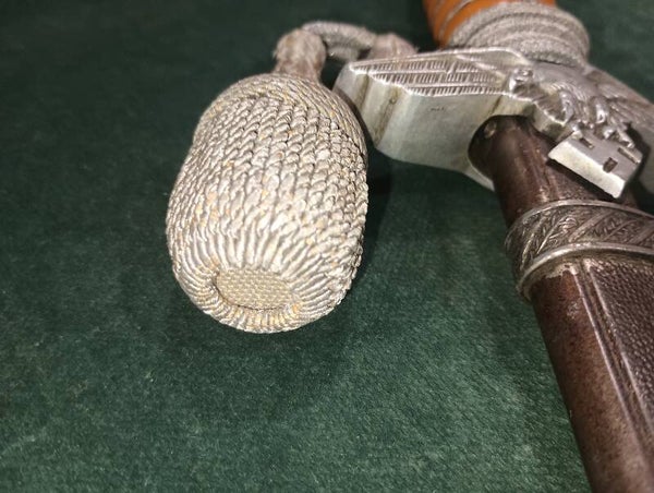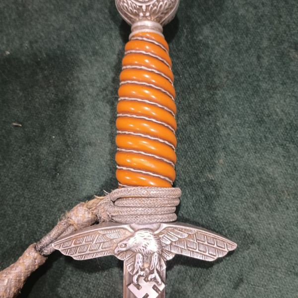 Beautiful early Paul Weyersburg 2nd Pattern Luftaffe Dagger with logo. Wonderful DESIRABLE Pumpkin Celluloid grip with double twist aluminum wire intact. Aluminum pommel and cross gaurd crisp with bold detail. Balde is brilliant with Paul Weyersberg logo with desirable stick eagle #5 acceptance mark. This is found on very few early 2nd pattern luftwaffe daggers. Nice tip with crisp edges and very light runner matks. Scabbard shell shows age patina with no dents. Typical weyersberg hanger fittings and rings intact. Overall dagger rates Very Good + and a fine example. Portapee and hangers are original to our acquiring item . both have wear from age and use. Photos do not do Dolce justice.